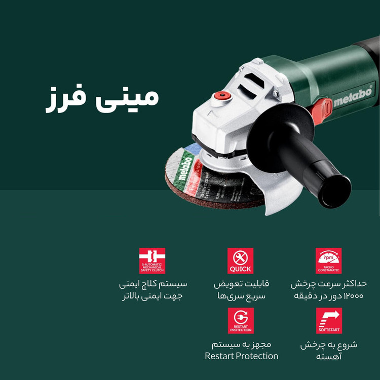 شرکت متابو یکی از شرکتهای معتبر در زمینه تولید انواع ابزارهای برقی در جهان است که با استفاده از توان طراحی و امتیاز تکنولوژیکی کشور آلمان بخش وسیعی از بازار مصرف ابزار برقی در جهان را به خود اختصاص داده است. کارخانه اصلی متابو در شهر صنعتی کوچک و زیبای نورتینگن آلمان قرار دارد. متابو علاوه بر آلمان در کشور چین هم در طی این سالها به روال بسیاری از شرکتهای بزرگ بین المللی،واحدی را راه اندازی کرده است. در این شرکت کلیه مراحل ساخت و کنترل کیفیت توسط متخصصین آلمانی شرکت اصلی متابو،صورت میپذیرد و در حال حاضر اکثر تولید بین المللی متابو در کارخانه شانگهای چین انجام میگیرد. پسوند QUICK LOCK در مهره زیر و رو با تکنولوژی قفل سریع باعث سرعت عمل و راحتی در بستن و باز کردن تیغه و جلوگیری از قفل شدن تیغه میگردد.تنوع در محصولات متابو باعث می شود طیف وسیعی از افراد را به سمت خود جلب نماید.شرکت متابو آلمان برای ساخت مینی فرز متابو از فن آوری های منحصربه فردی استفاده می کند مانند استفاده از قدرت بسیار بالا در حجم بسیار پایین پوسته که به کاربر اجازه می دهد در مکانهایی که مینی فرز های سری دسته بلند جواب گو نیستند به راحتی مشکلات خود را رفع کنند.مینی سنگ متابو مدل WQ 1100-125 دارای یک موتور با توان 1100 وات بوده که یکی از قویترین ها در این سایز میباشد که می تواند صفحه سنگ را با سرعت 12000 دور در دقیقه به گردش در آورد.برای نصب صفحات سنگ بر روی دستگاه باید اول نوع کار که برش است یا ساب معلوم شود و بعد با توجه به مدل ابزار سایز صفحه مناسب را انتخاب نمود. برای استفاده از مینی فرز WQ 1100-125 متابو می بایست از صفحاتی با قطر 125 میلی متر استفاده کنید. از جمله نقاط قوت این محصول تکنولوژی محافظت در برابر گرد و غبار آن است که موجب افزایش طول عمر و کارایی دستگاه می شود. دسته کمکی این مینی فرز در دو طرف چپ و راست ابزار به راحتی قابل نصب است. گارد محافظ وظیفه جلوگیری از پرتاب براده های سنگ و فلز را به سمت کاربر را دارد. از دستگاه های مینی فرز برای برش و یا سایش فلزات، سنگ و چوب استفاده می شود. در مصارف خانگی و یا صنعتی می توانید برای برش مصالح ساختمانی مثل برش گچ،سیمان و کاشی این ابزار برقی کاربرد دارد.
