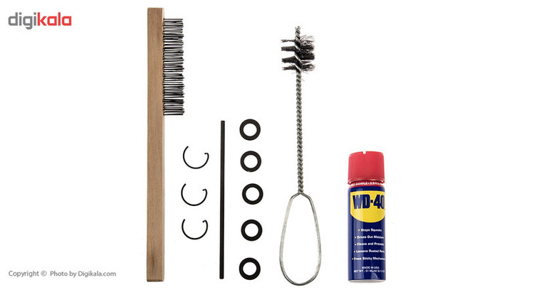 اقلام همراه- عینک ایمنی - روغن روانکار WD40 - پنج عدد استپ رینگ - فنر استپ رینگ - دو فرچه جهت تمیزکردن سیلندر و پیستون - میله - دستمال - کیف حمل