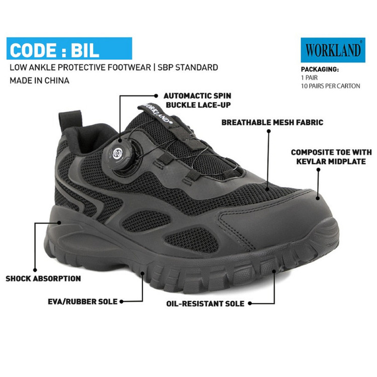 این مدل کفش متعلق به برند WORKLAND تولید شده در کشور چین می باشد .کفش در بخش رویه و زیره دارای کیفیت بسیار بالایی می باشد . طراحی آن بسیار اسپرت و ظریف بوده و اصلا در نگاه اول کفش ایمنی بنظر نمی رسد . جنس رویه آن ترکیبی از چرم و مش قابل شستشو می باشد . این ترکیب باعث می شو تا گردش هوای مناسبی در کفش ایجاد گردد . سرپنجه این کفش از جنس کامپوزیت است. زیره کفش از جنس EVA و لاستیک بوده و وزن سبکب را دارد . زیره خاصیت آنتی شوک ( SHOCK ABSORPTION جاذب ضربه ) و ضد لغزش و و مقاوم در برابر روغن و مشتقات نفتی است .ویژگی خاص این کفش در بندهای آن است که بصورت چرخشی و است و به راحتی در پوشیدن و بیرون اوردن کفش کمک می کند .