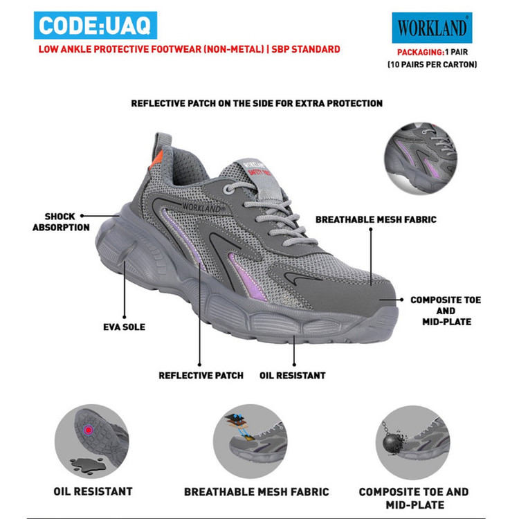 این مدل کفش متعلق به برند WORKLAND تولید شده در کشور چین می باشد .کفش در بخش رویه و زیره دارای کیفیت بسیار بالایی می باشد . طراحی آن بسیار اسپرت و ظریف بوده و اصلا در نگاه اول کفش ایمنی بنظر نمی رسد . جنس رویه آن ترکیبی از پارچه مش و چرم مصنوعی بوده و کفش دارای تنفس پذیری بالایی می باشد . سرپنجه این کفش از جنس کامپوزیت است . زیره کفش از جنس EVA و لاستیک و آنتی شوک ( SHOCK ABSORPTION جاذب ضربه ) و ضد لغزش و همچنین مقاوم در برابر روغن و مشتقات نفتی می باشد . وزن هر لنگه این کفش ( سایز 40) 360 گرم بوده و بسیار سبک است .سایز این مدل کفش استاندارد است . بعنوان مثال اندازه کفی قرار گرفته داخل کفش در سایز 42 ( 27 سانتیمتر ) و در سایز 43 ( 28 سانتیمتر ) می باشد .