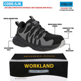 این مدل کفش متعلق به برند WORKLAND تولید شده در کشور چین می باشد .کفش در بخش رویه و زیره دارای کیفیت بسیار بالایی می باشد . طراحی آن بسیار اسپرت و ظریف بوده و اصلا در نگاه اول کفش ایمنی بنظر نمی رسد . جنس رویه آن ترکیبی از پارچه مش و چرم بوده و کفش دارای تنفس پذیری بالایی می باشد . سرپنجه این کفش از جنس کامپوزیت است . زیره کفش از جنس EVA و لاستیک و آنتی شوک ( SHOCK ABSORPTION جاذب ضربه ) و ضد لغزش و همچنین مقاوم در برابر روغن و مشتقات نفتی می باشد . این کفش FREE METAL بوده و می تواند تا 380 ولت عایق برق باشد. وزن هر لنگه این کفش ( سایز 43 ) 490 گرم می باشد .
