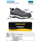 این مدل کفش متعلق به برند WORKLAND تولید شده در کشور هند می باشد .کفش در بخش رویه و زیره دارای کیفیت بسیار بالایی می باشد . طراحی آن بسیار اسپرت و ظریف بوده و اصلا در نگاه اول کفش ایمنی بنظر نمی رسد . جنس رویه آن ترکیب از چرم و لایه مش مشبک است که موجب شده کفش دارای تنفس پذیری مناسبی می باشد . سرپنجه این کفش از جنس کامپوزیت است . زیره کفش از جنس لاستیک و آنتی شوک ( SHOCK ABSORPTION جاذب ضربه ) و ضد لغزش و همچنین مقاوم در برابر روغن و مشتقات نفتی می باشد . وزن هر لنگه این کفش ( سایز 43) 500گرم بوده و سبک است .