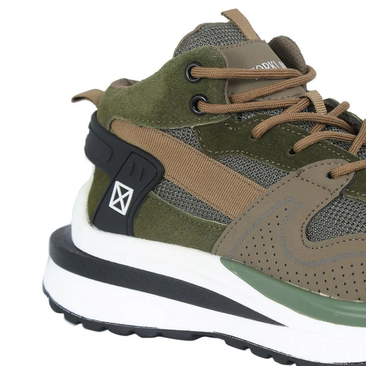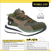 این مدل کفش متعلق به برند WORKLAND تولید شده در کشور چین می باشد . وزن این کفش نسبتا سبک بود و هر لنگه آن ( سایز 42 ) 515گرم وزن دارد . طراحی آن بسیار اسپرت و ظریف بوده و اصلا در نگاه اول کفش ایمنی بنظر نمی رسد . جنس رویه آن ترکیبی از چرم جیر و پارچه بافت مش تنفس پذیر با طراحی بسیار زیبا و چشمگیر می باشد . سرپنجه این کفش از جنس استیل است . زیره کفش از جنس PU , آنتی شوک ( SHOCK ABSORPTION جاذب ضربه ) در قسمت پاشنه پا و ضد لغزش بوده و منعطف و همچنین مقاوم در برابر روغن و مشتقات نفتی می باشد . ساق این کفش متوسط می باشد و قوزک پا را بخوبی پوشش می دهد .