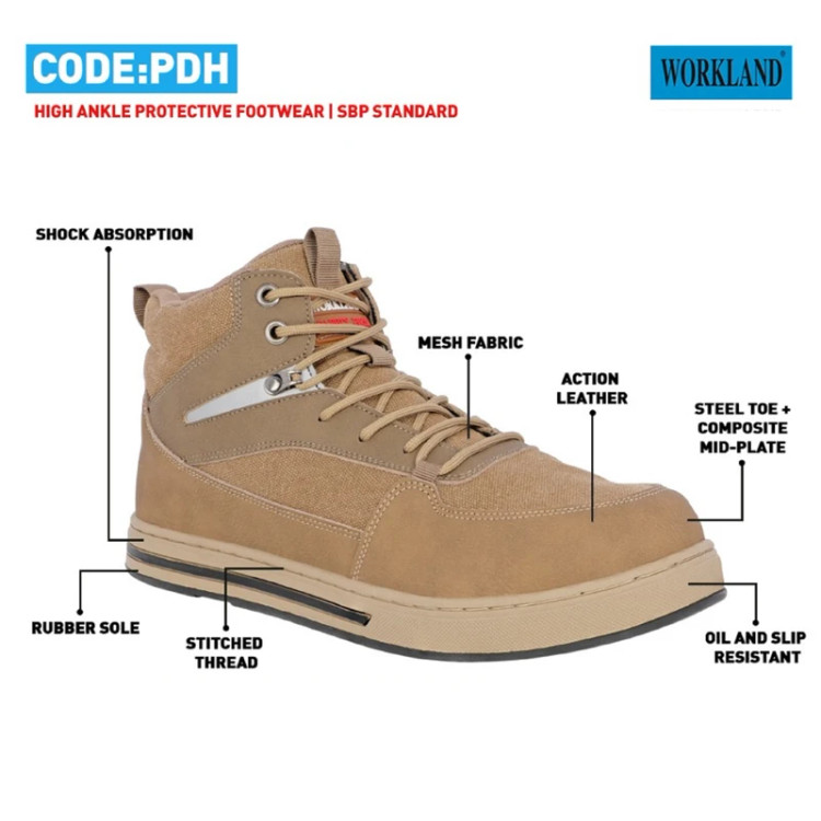 این مدل کفش متعلق به برند WORKLAND تولید شده در کشور چین می باشد .کفش در بخش رویه و زیره دارای کیفیت بسیار بالایی می باشد . طراحی آن بسیار اسپرت و ظریف بوده و اصلا در نگاه اول کفش ایمنی بنظر نمی رسد . جنس رویه آن ترکیبی از چرم طبیعی اکشن و پارچه برزنتی بوده و کفش دارای تنفس پذیری مطلوبی می باشد . سرپنجه این کفش از جنس فلز است . زیره کفش از جنس لاستیک و آنتی شوک ( SHOCK ABSORPTION جاذب ضربه ) و ضد لغزش و همچنین مقاوم در برابر روغن و مشتقات نفتی می باشد . وزن هر لنگه این کفش ( سایز 43) 560 گرم بوده و سبک است .
