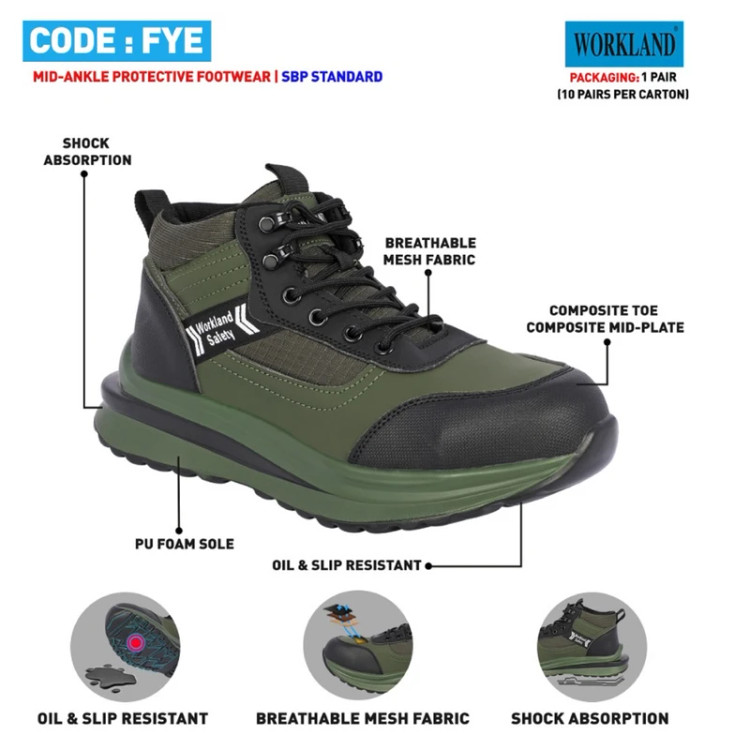 این مدل کفش متعلق به برند WORKLAND تولید شده در کشور چین می باشد .کفش در بخش رویه و زیره دارای کیفیت بسیار بالایی می باشد . طراحی آن بسیار اسپرت و ظریف بوده و اصلا در نگاه اول کفش ایمنی بنظر نمی رسد . جنس رویه آن از چرم و مش برزنت می باشد جنس سرپنجه لایه میانی نفوذناپذیر در زیره این کفش از جنس کامپوزیت است . زیره کفش از جنس PU FOAM و آنتی شوک ( SHOCK ABSORPTION جاذب ضربه ) و ضد لغزش و همچنین مقاوم در برابر روغن و مشتقات نفتی می باشد . وزن هر لنگه این کفش ( سایز 43) 550 گرم است . سایز این مدل کفش استاندارد است . بعنوان مثال اندازه کفی قرار گرفته داخل کفش در سایز 43 ( 27.5 سانتیمتر ) می باشد .